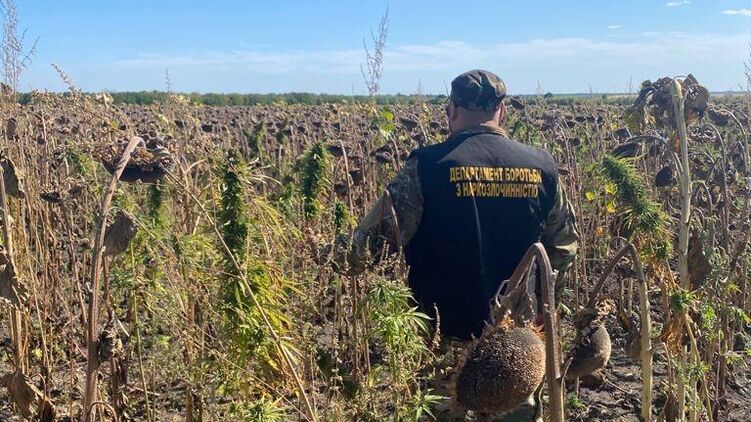 В Днепропетровской области полиция обнаружила насаждения конопли на поле с подсолнечниками. Фото: Нацполиция