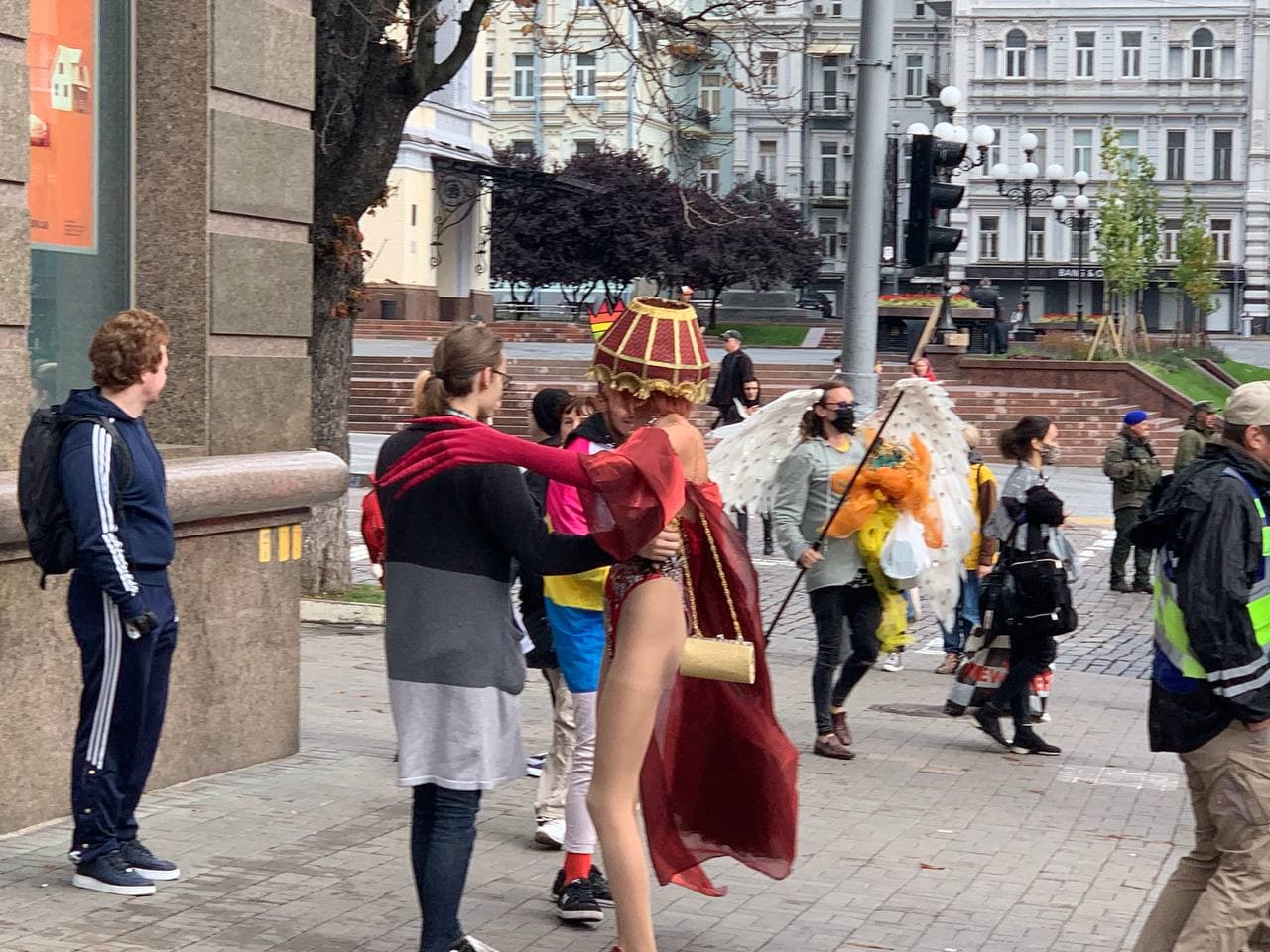11:04 Уже сейчас начинается шествие ЛГБТ. Одновременно заработала передвижная сцена - непременный атрибут гей-парадов, где идет травести-шоу. Его ведет мужчина в женском костюме "ангела".