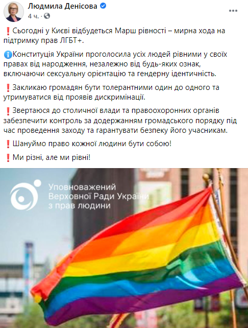 11:40 Омбудсмен Людмила Денисова поддержала "Марш равенства" и запостила у себя в Facebook фото с радужным ЛГБТ-флагом.