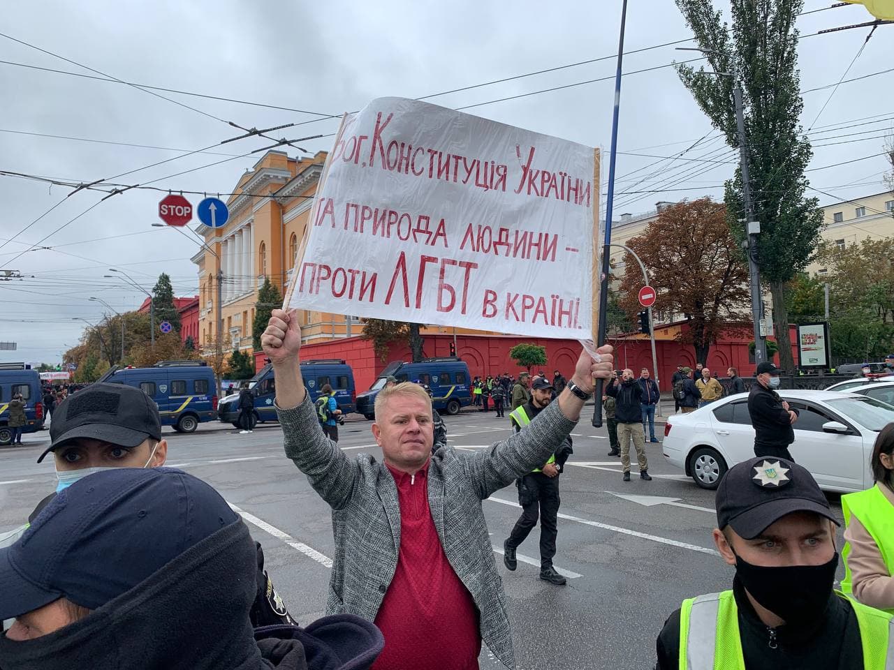 11:24 К "Маршу равенства" вышел нардеп из группы "За будущее" Виктор Мялик с плакатом "Бог, Конституция Украины и природа человека - против ЛГБТ в Украине".