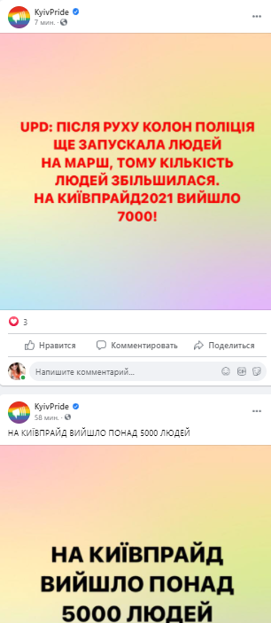 12:03 Организация "Киевпрайд" сначала сообщила, что на марш вышло пять тысяч человек, потом добавила к ним еще две тысячи. Итого семь.