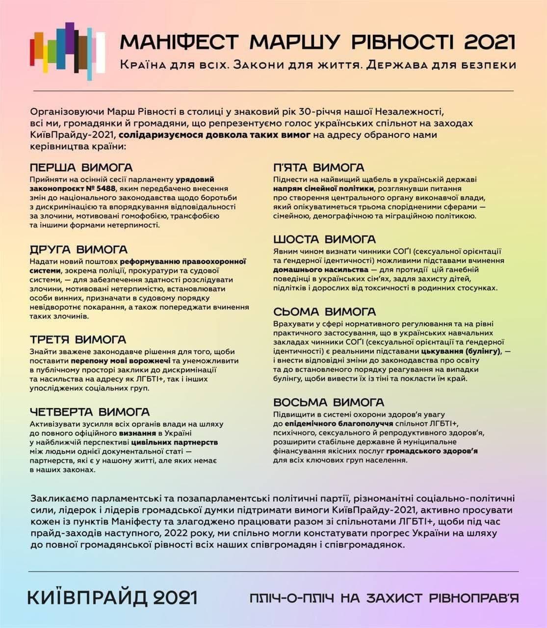 Основное их требование - принять законопроект № 5488, который устанавливает новую ответственность за дискриминацию. Кабмин его внес в Раду еще в мае, но незадолго до Марша равенства его включили в повестку дня - то есть планируют рассмотреть в ближайшее время.