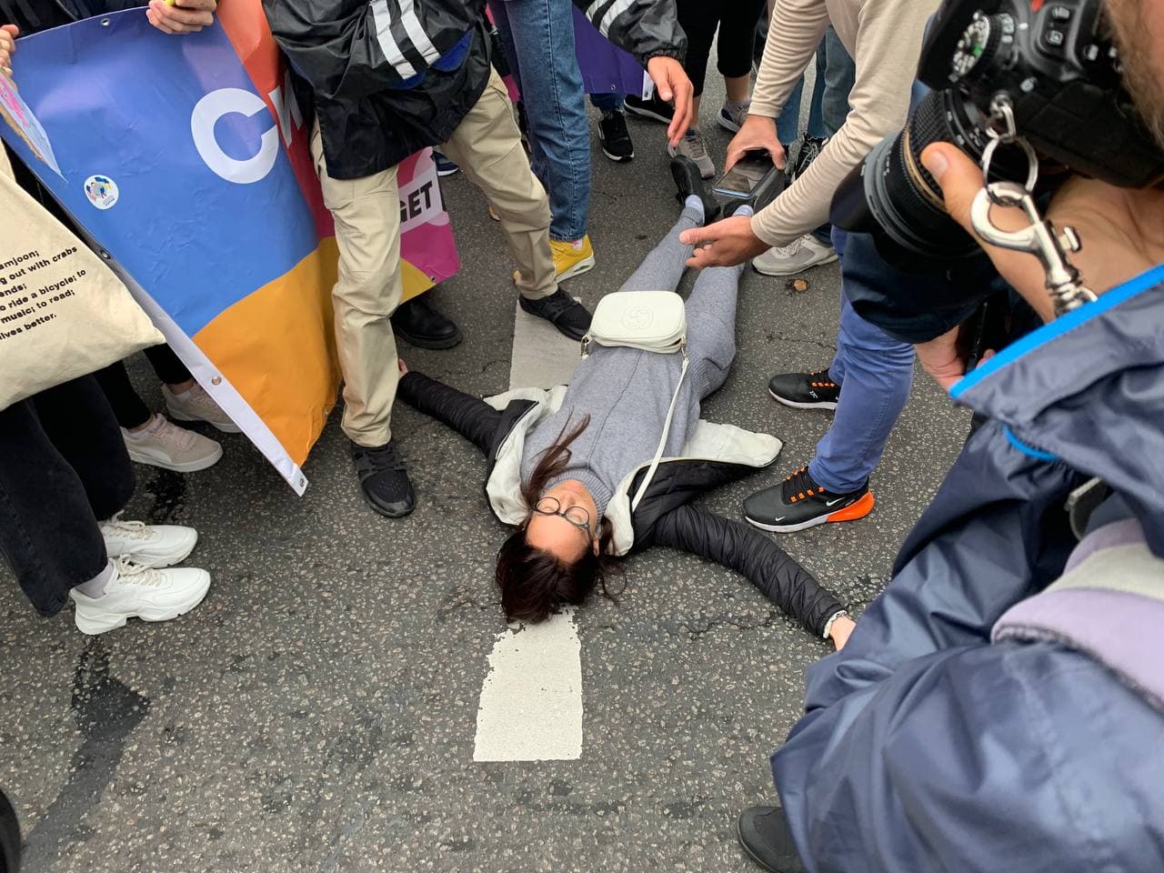 11:22 Участница ЛГБТ-марша устроила перформанс — просто упала посреди улицы и лежит на дороге.