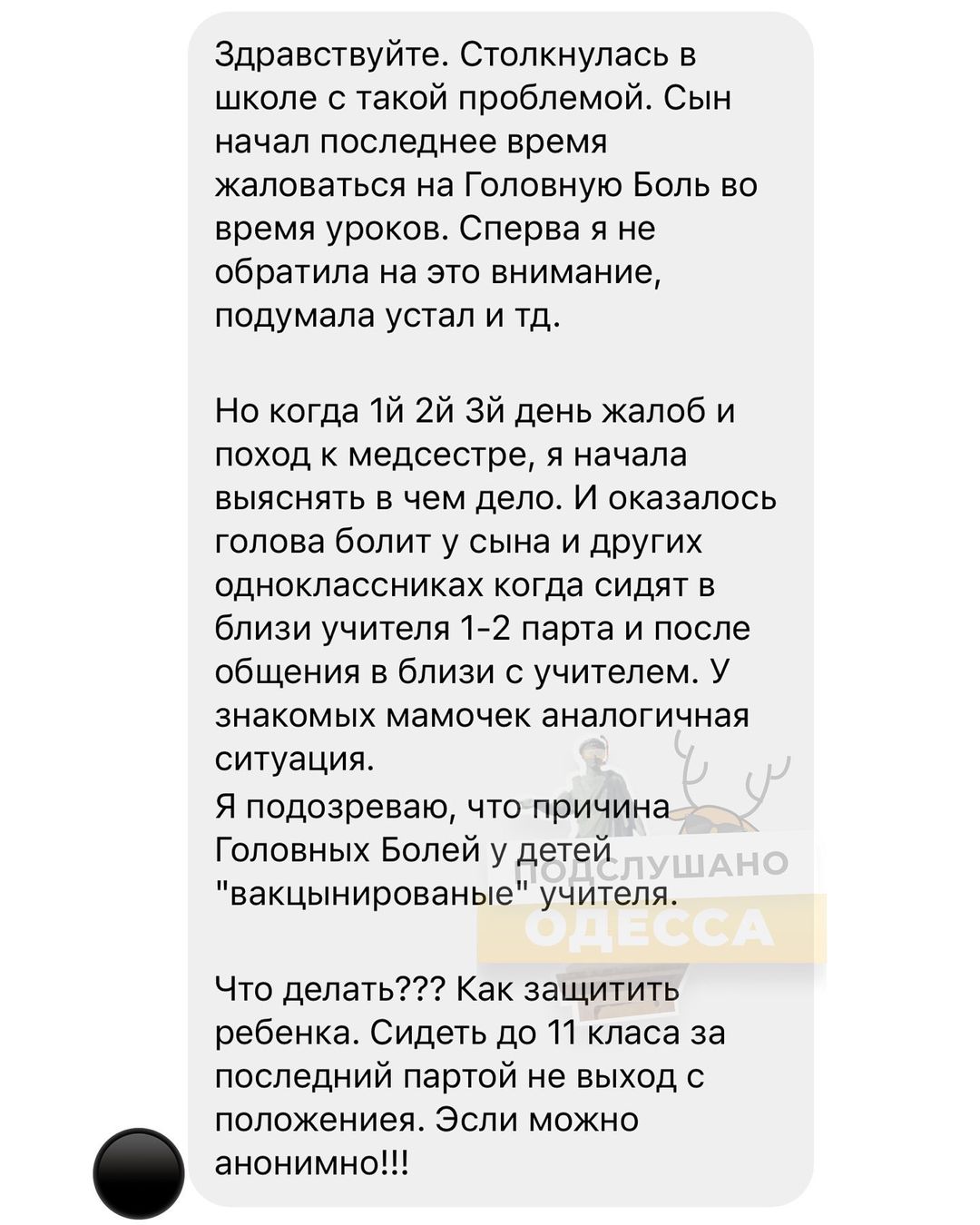 В Одессе мама ученика одной из местных школ пожаловалась в соцсети, что у ее ребенка якобы начинаются головные боли, когда он находится рядом с вакцинированной учительницей.