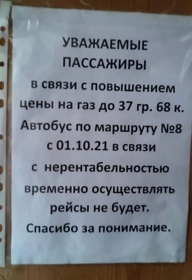В транспорте появились такие объявления: "Уважаемые пассажиры. В связи с повышением цены на газ до 37,68 грн. автобус по маршруту №8 с 01.10.21 в связи с нерентабельностью временно осуществлять рейсы не будет. Спасибо за понимание".