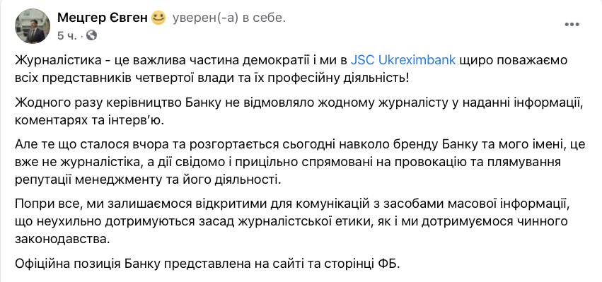 На скандал отреагировал глава банка Евгений Мецгер. Он, выбрав статус "уверен в себе", написал: "То, что произошло вчера и разворачивается сегодня вокруг бренда банка и моего имени, это уже не журналистика, а действия сознательно и прицельно направлены на провокацию и покушении на незапятнанную репутацию менеджмента и его деятельности".