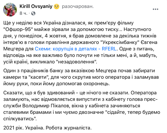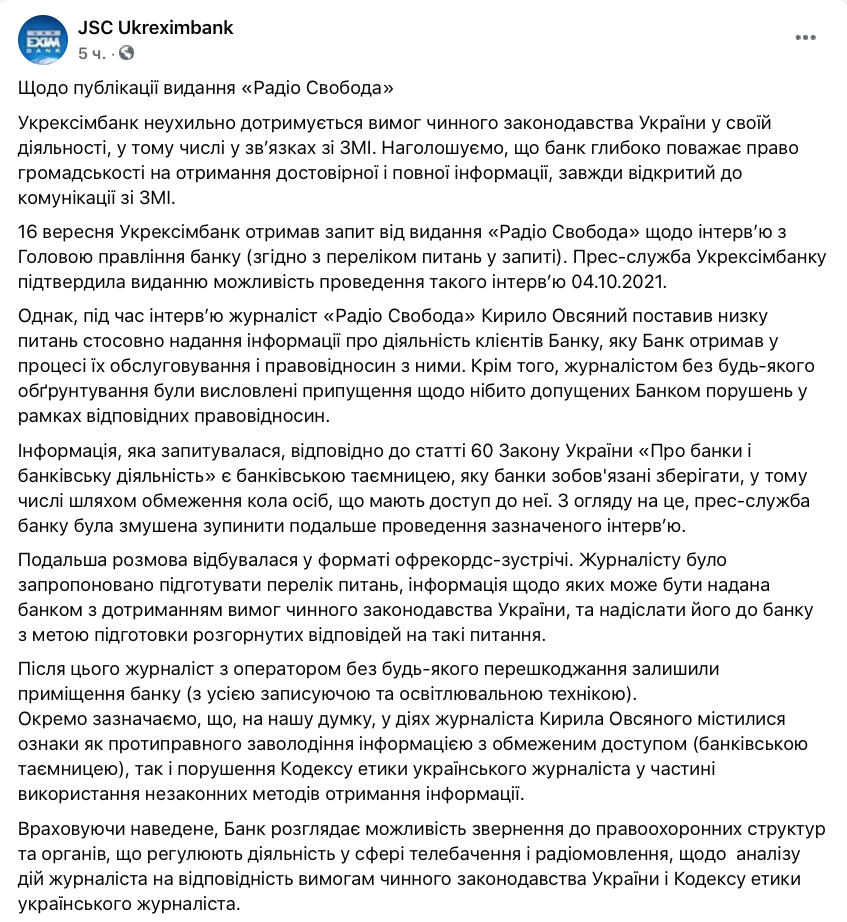 "16 сентября "Укрэксимбанк" получил запрос от издания "Радио Свобода" относительно интервью с председателем правления банка (согласно перечню вопросов в запросе). Пресс-служба подтвердила изданию возможность проведения такого интервью 04.10.2021.