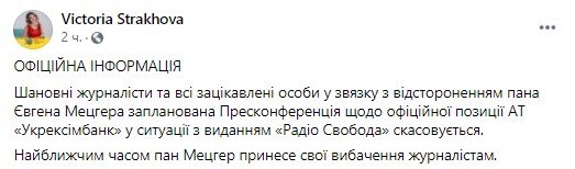 "Уважаемые журналисты и все заинтересованные лица в связи с отстранением господина Евгения Мецгера запланированная пресс-конференции по официальной позиции АО "Укрэксимбанк" в ситуации с изданием "Радио Свобода" отменяется", - говорится в сообщении.