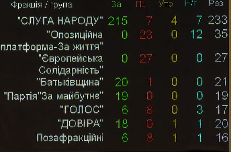 215 голосов дала "Слуга народа", 20 голосов добавила "Батькивщина" (хотя ее представители критиковали "слуг"), 19 голосов - группа Коломойского "За будущее", 18 голосов - "Доверие" и 6 - "Голос".