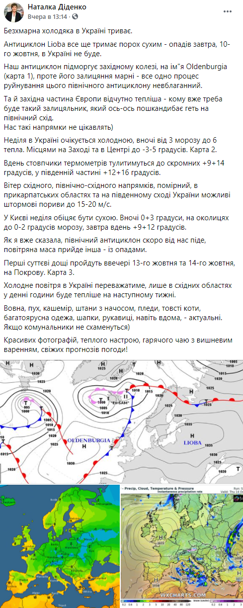 Она написала о том, что как только из Украины уйдет северный антициклон, формирующий "безоблачную холодяку", в страну придет воздушная масса с осадками.