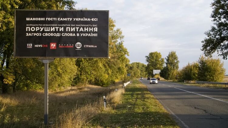 В Киеве, в преддверии саммита Украина-ЕС, который состоится 12 октября, журналисты незаконно заблокированных через санкции СНБО украинских медиа обратились к участникам саммита с помощью билбордов.