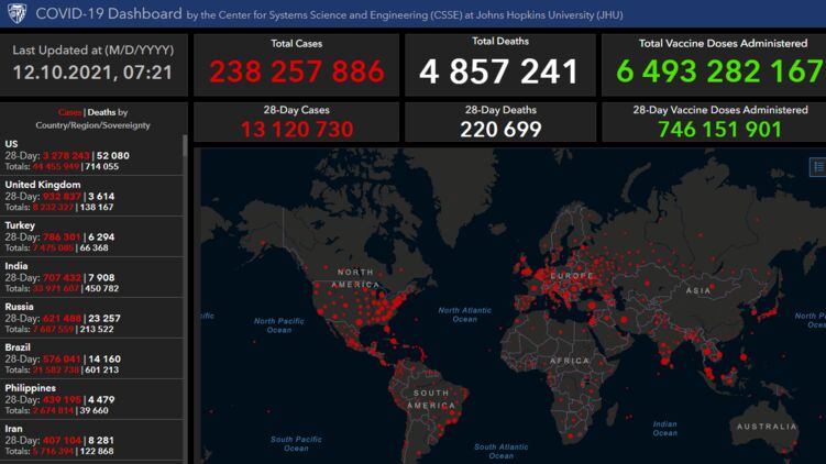 Университет Джона Хопкинса также привел печальную статистику на утро 12 октября. С начала пандемии на планете уже 238 257 886 человек заразились СOVID-19.