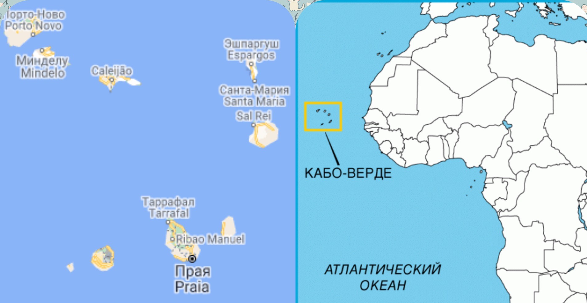 Столица Кабо-Верде - Прая. Наивысшая точка страны - вулкан Фогу (2829 метров), последнее извержение которого произошло 23 ноября 2014 года. В результате этого местные власти закрывали аэропорт и эвакуировали местных жителей.