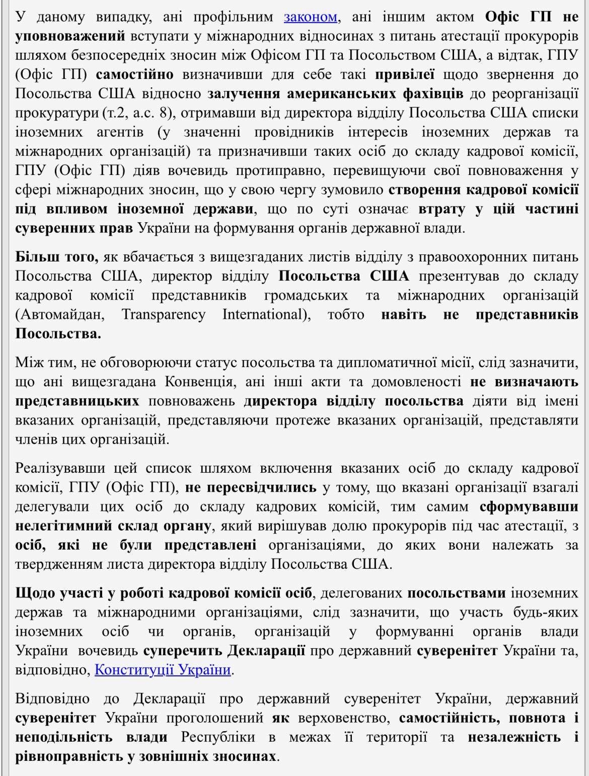 В документе сказано, что ни профильный закон, ни другой акт не уполномочивает Офис генпрокурора вступать в международных отношения по вопросам аттестации прокуроров путем непосредственных сношений между Офисом и посольством США. И что Офис, самостоятельно определив для себя привилегию обращаться к посольству США для привлечения американских специалистов к реорганизации прокуратуры, получив от директора отдела посольства США списки иностранных агентов (то есть проводников интересов иностранных государств и международных организаций) и назначив таких лиц в состав кадровой комиссии, действовал явно противоправно. Это обусловило создание кадровой комиссии под влиянием иностранного государства и означает потерю суверенных прав Украины на формирование органов государственной власти.