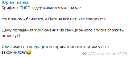 "Брифинг СНБО задерживается уже на час. Уж полночь близится, а Путина всё нет, как говорится.