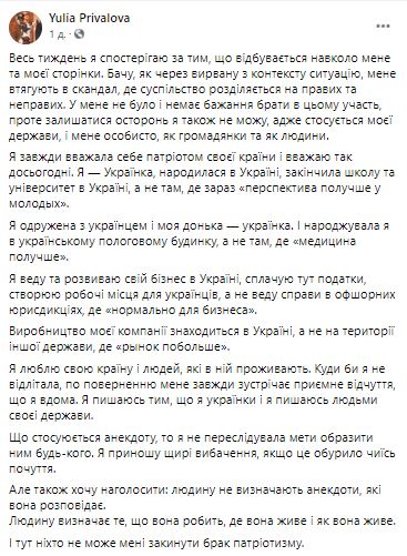 "Всю неделю я наблюдаю за тем, что происходит вокруг меня и моей страницы. Вижу, как из-за вырванной из контекста ситуации, меня втягивают в скандал, где общество разделяется на правых и неправых. У меня не было и нет желания принимать в этом участие, однако оставаться в стороне я также не могу, ведь касается моей страны, и меня лично, как гражданки и как человека.