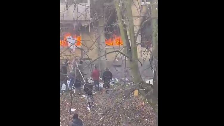 На кадрах с места событий видно, как с балкона второго этажа горящего дома выпрыгивают люди. На видео можно заметить, как один человек стоит на балконе и скидывает вниз второго, вероятнее всего, ребенка, внизу его ловит группа людей.