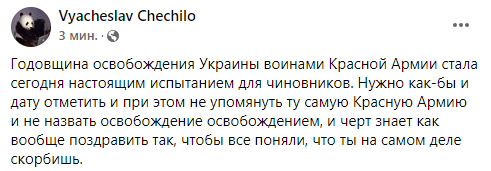 "Годовщина освобождения Украины воинами Красной Армии стала сегодня настоящим испытанием для чиновников. Нужно как-бы и дату отметить и при этом не упомянуть ту самую Красную Армию и не назвать освобождение освобождением, и черт знает как вообще поздравить так, чтобы все поняли, что ты на самом деле скорбишь", - написал журналист Вячеслав Чечило на своей странице в Facebook.