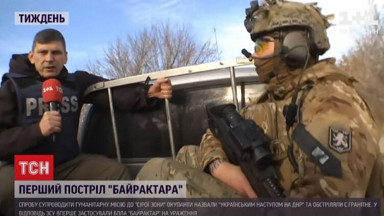 В сюжете повторяется официальная версия Киева: военные зашли с гуманитарной миссией (доставка угля). Позже они ушли, но потом противник открыл огонь из артиллерии и в ответ ВСУ использовали "Байрактар".