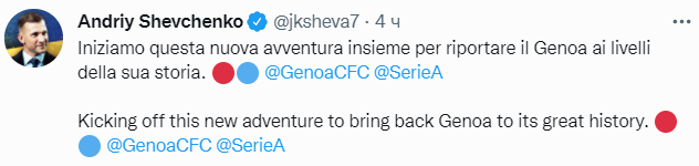 "Как футболист, Шевченко выиграл, среди прочего, Золотой мяч в 2004 году и Лигу чемпионов в 2003 году. Его тренерская карьера привела украинскую сборную с июля 2016 года к историческому месту в восьмерке лучших команд Европы на Евро-2020", - говорится в приветственном сообщении на сайте "Дженоа".