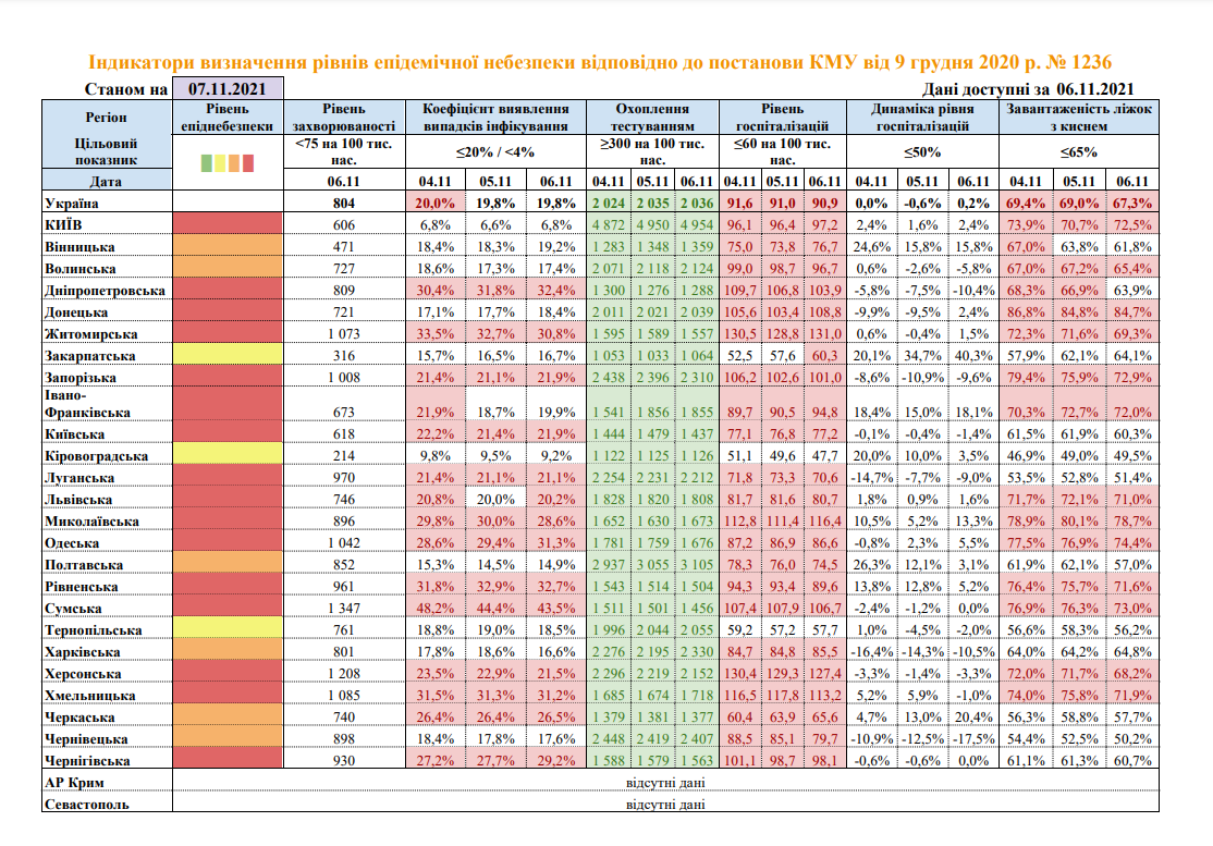 В воскресенье, 7 ноября, в Украине в "красной" зоне эпидемической опасности находится Киев и еще 15 областей. В то же время в "желтой" зоне находятся только три региона.