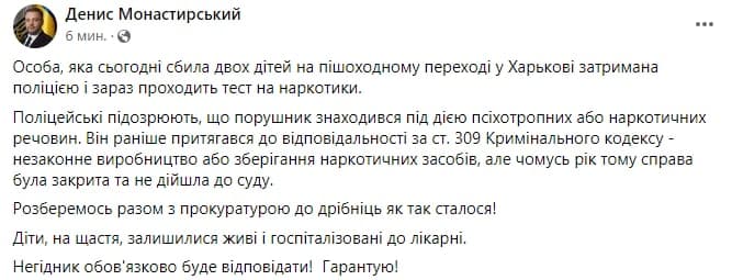 Человек, который находясь за рулем внедорожника, сбил двоих детей на пешеходном переходе в Харькове, задержан полицией и сейчас проходит тест на наркотики. Об этом сообщил глава МВД Денис Монастырский.