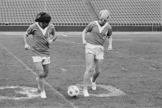 18. Большой поклонник футбола (и футболистов) Элтон Джон разминается вместе с Джорджем Бестом. Лос-Анджелес, 1976 год.