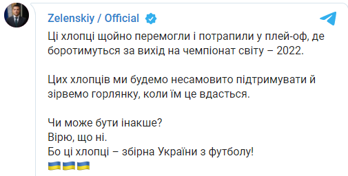 После матча Владимир Зеленский на своей странице в Telegram поздравил футболистов с победой.