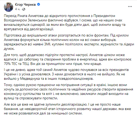 "Переход Рината Ахметова в открытое противостояние с президентом Владимиром Зеленским фактически состоялся. И похоже, что на наших глазах вырисовывается сценарий, по которому он будет действовать дальше, чтобы сменить власть", - написал в соцсети "слуга народа" Егор Чернев.