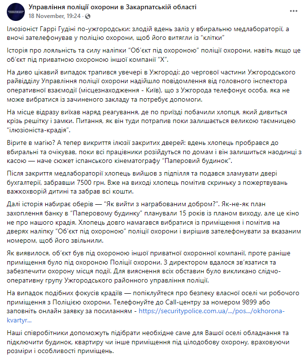 "Парень долго пытался выбраться из помещения, заметил на дверях наклейку "Объект под охраной" полиции охраны и решил позвонить по указанному номеру, чтобы его освободили", - говорится в посте.