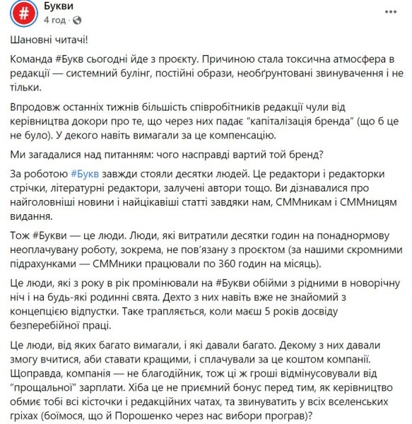 В конце автор поста заявил, что другие журналисты "Букв" тоже опубликуют свои истории о внутренней кухне издания.