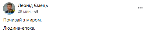 Народный депутат Леонид Емец, который первым сообщил о том, что Омельченко попал в больницу с коронавирусом в тяжелом состоянии, выразил свои слова соболезнования: