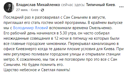 "Последний раз я разговаривал с Сан Санычем в августе, приглашал его стать гостем моей программы. В крайнем выпуске мы с Владимиром Яловым вспоминали времена Омельченко. Его рабочий день начинался в 5.30 утра, он часто собирал неожиданные совещания в 12 ночи в пятницу на которых были все главные городские чиновники. Перекрывал канализацию в офисе Киевэнерго, когда те давали плохие условия для Киева. При нем регулярно поливали городские улицы и открывали станции метро. К сожалению, мы так и не поговорим про это все с Сан Санычем. Но будем помнить его. Царство небесное и Светлая память!"