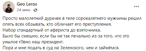 Через некоторое время Лерос опубликовал пост в Facebook, что подаст на Зеленского в суд.