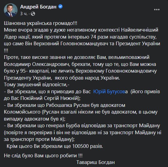 "Вы соврали что Рябошапка Руслан был адвокатом Коломойского. Руслан вообще никогда не был адвокатом, в этом случае адвокатом был я. Вы соврали что генерал Бурба отвечал за транспорт Майдана (поверьте я проверил и он не отвечал ни за транспорт Майдана ни за транспорт против Майдана). Кроме этого Вы соврали еще 100 500 раз", - написал Богдан.