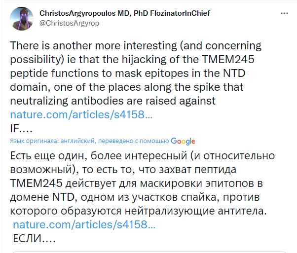 В то же время высказано предположение, что вирус захватил часть человеческого РНК, чтобы замаскировать ею свои высокоиммуногенные участки S–белка, на которые приходится основная атака антител. Закрыв спайк–белок пептидами от TMEM245, вирус фактически прикрылся "овечьей шкурой". Таким образом антитела не могут атаковать TMEM245, этот белок распознается как "свой".