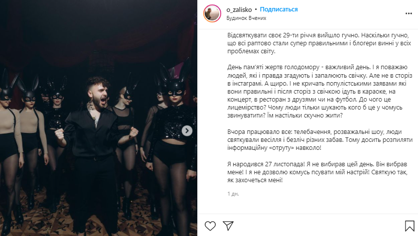 Парень отмечал свой 29-й день рождения. И эта дата совпала с днем, когда в Украине чтят память жертв Голодоморов. Поэтому после того, как в сториз начали появляться фото и видео с тусовки, участников тут же обвинили в "цинизме" и "недостойном поведении".