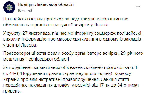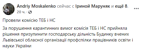 В понедельник, 29 ноября, первый заместитель мэра Львова Андрей Москаленко сообщил, что за нарушение карантинных требований комиссия ТЭБ и ЧС приняла решение приостановить хозяйственную деятельность Дома ученых, где проходила вечеринка.