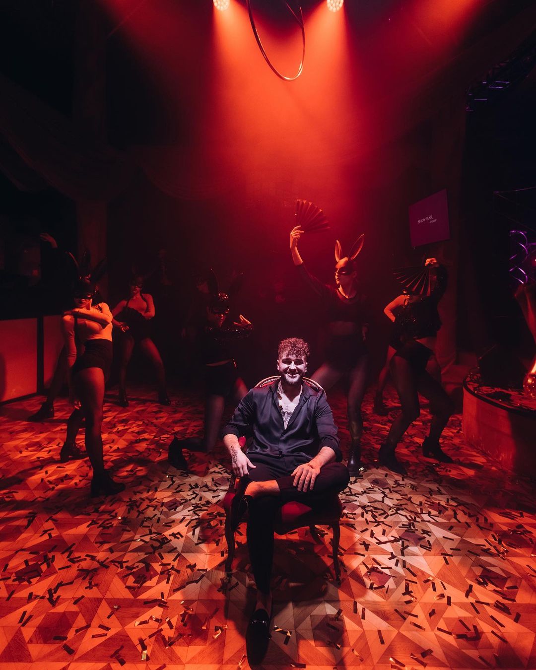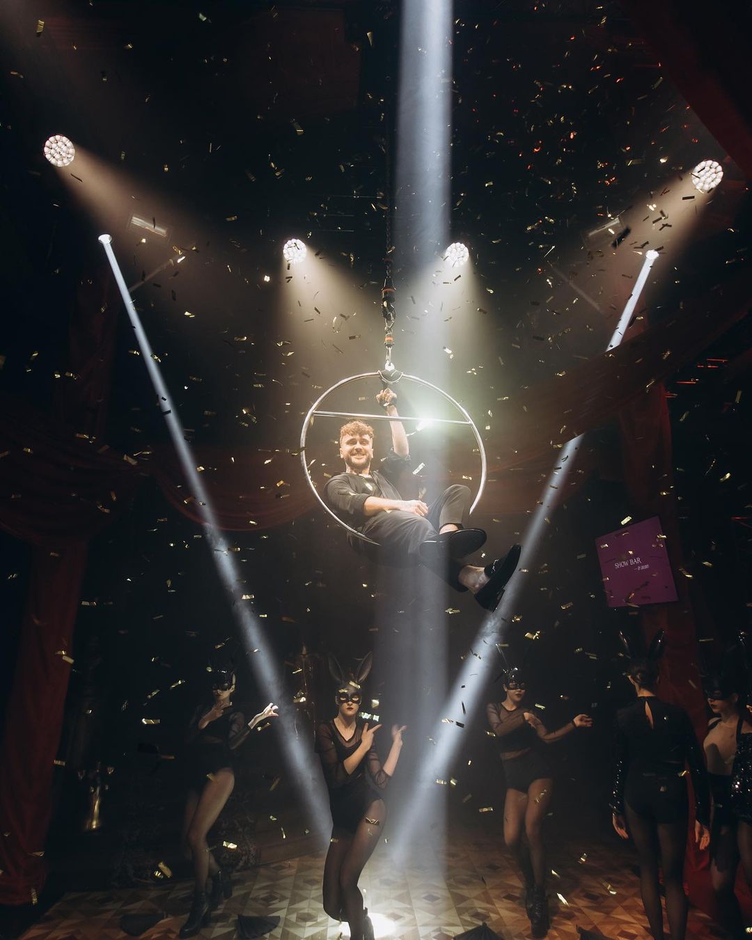 Герой дня появился на празднике эффектно - сидя под потолком на кольце, которое используют воздушные гимнасты. Действо сопровождалось танцем девушек в черных кроличьих масках и падающим сверху золотым конфетти.