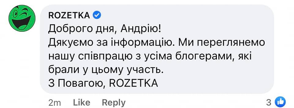 Rozetka обещала "пересмотреть сотрудничество со всеми блогерами, которые в этом участвовали". Типичный сдержанный ответ маркетологов.