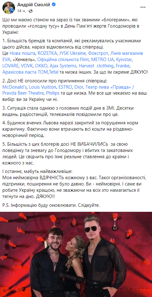 "До сих пор не объявили о прекращении сотрудничества: McDonald's, Louis Vuitton, ESTRO, Dior, Театр пива "Правда"/Pravda Beer Theatre, Philips и еще ряд. Мы все еще ждем вашего выбора: вы за Украину или нет", - ставит ультиматум компаниям глава общественной организации "Українська Україна" Андрей Смолий.