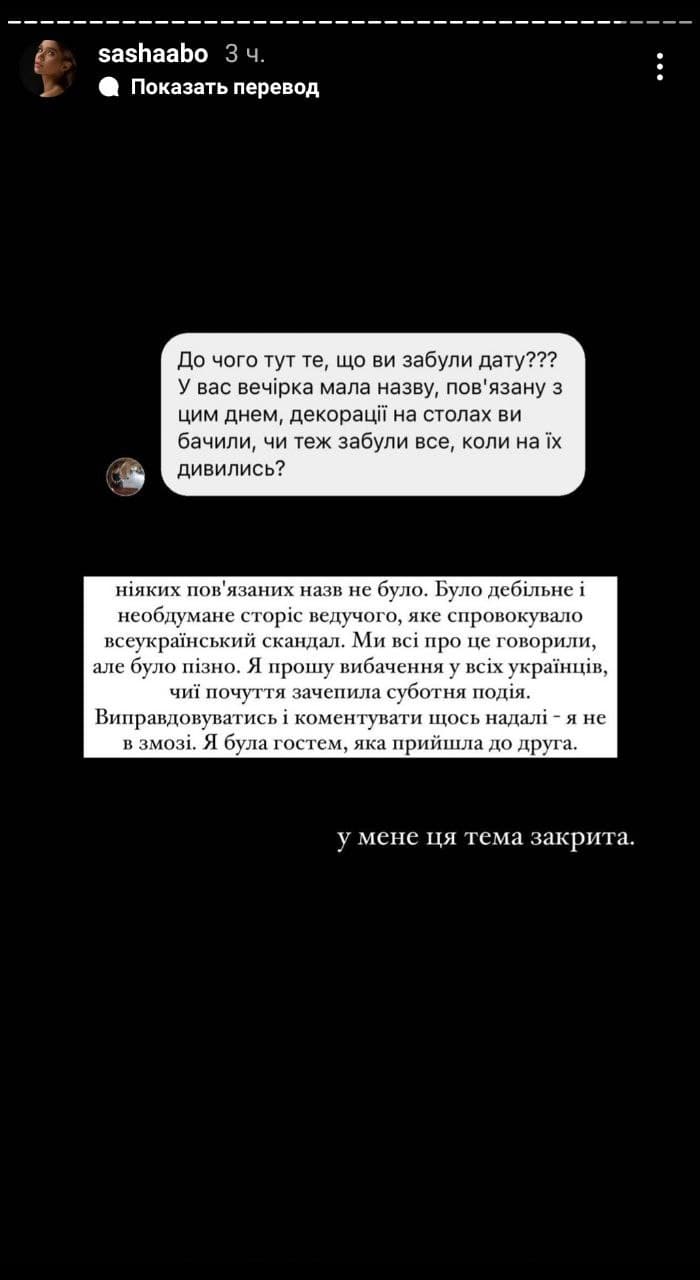 Блогерша Саша Бо (Александра Пустовит) тоже оправдалась за то, что присутствовала на дне рождения Залиско в День памяти голодоморов.