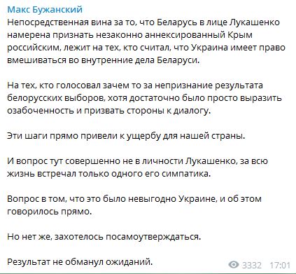 Депутат от "Слуги народа" Максим Бужанский написал, что вина за то, что Минск собирается признать Крым российским лежит на тех, кто считал, что Украина может вмешиваться в дела Беларуси.