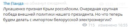 "Лукашенко признал Крым российским. Очередная крупная победа внешней политики нашего президента. Но что теперь будем делать с импортом белорусской электроэнергии?".
