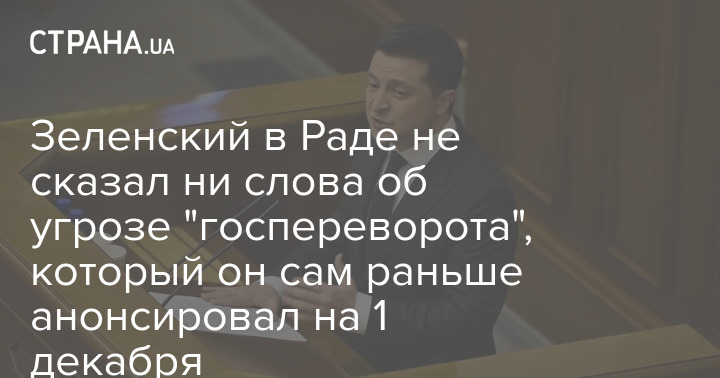 Президент Украины Владимир Зеленский в ходе ежегодного послания в Верховной Раде, в среду, 1 декабря, ничего не сказал об угрозе "госпереворота", который он сам ранее анонсировал на сегодня.