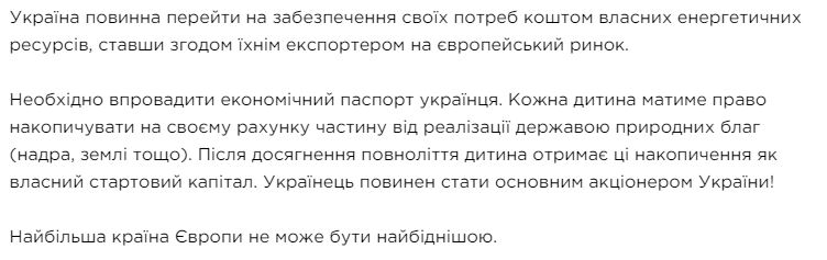"Необходимо ввести экономический паспорт украинца. Каждый ребенок будет иметь право накапливать на своем счете часть от реализации государством природных благ (недра, земли и т.п.). После достижения совершеннолетия ребенок получит эти накопления в качестве собственного стартового капитала", - говорилось в одном из пунктов программы.