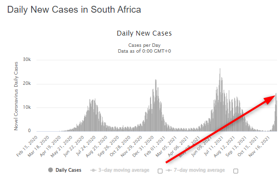 Сайт Worldometers показывает, что в Южной Африке заболеваемость резко выросла с конца ноября - то есть когда "Омикрон" был обнаружен. Она доросла до весеннего максимума, хотя до этого была на самом низком уровне за всю пандемию.
