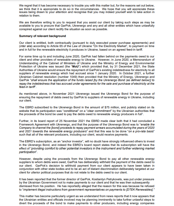 В письме к МВФ указано, что в настоящее время ДТЭК ВИЭ принимает меры по привлечению должностных лиц государственной компании "Гарантированный покупатель" и правительству к ответственности согласно законодательству Великобритании.