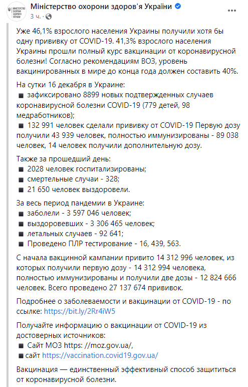 "Уже 46,1% взрослого населения Украины получили как минимум одну прививку против Covid-19. 41,3% взрослого населения Украины прошли полный курс вакцинации против коронавирусной болезни! Согласно рекомендациям ВОЗ, показатель привитых людей в мире до конца года должен составлять 40%", - сообщили в Минздраве.