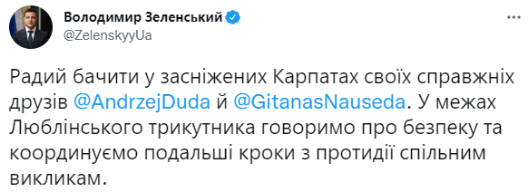 "Рад видеть в заснеженных Карпатах своих настоящих друзей Анджея Дуду и Гитанаса Науседу. В рамках Люблинского треугольника говорим о безопасности и координируем дальнейшие шаги по противодействию общим вызовам", - написал в своем Twitter Зеленский.